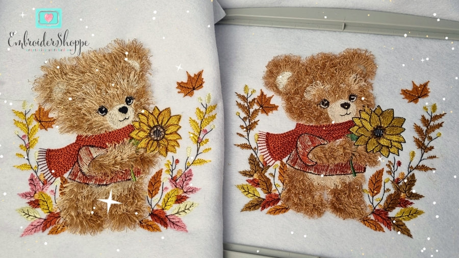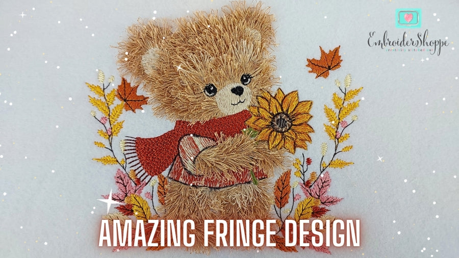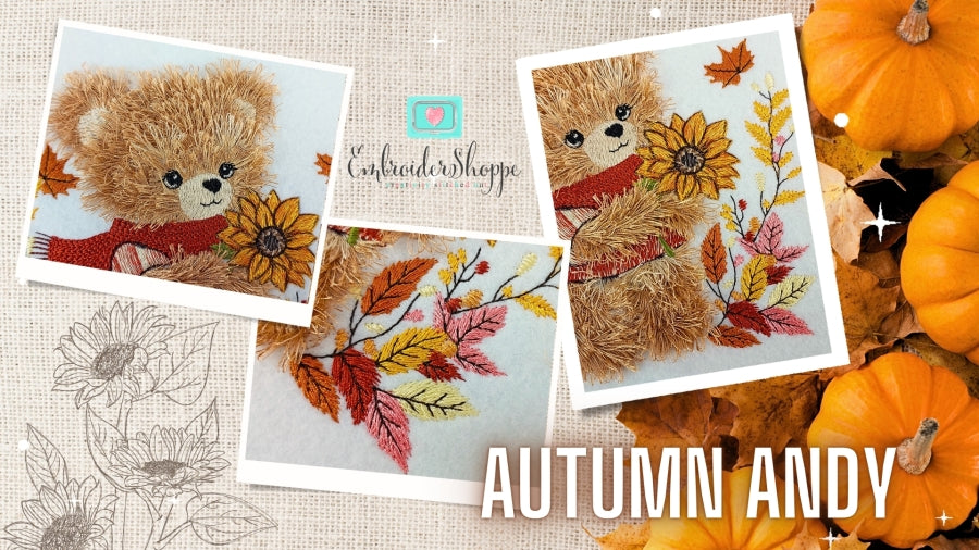 This delightful project is designed for the 5x7" hoop, featuring adorable fringed Autumn Bear Andy that add a fun, fluffy, 3D touch to your embroidery creations. Its not a hand-sewing pattern this is all about the magic of machine embroidery!