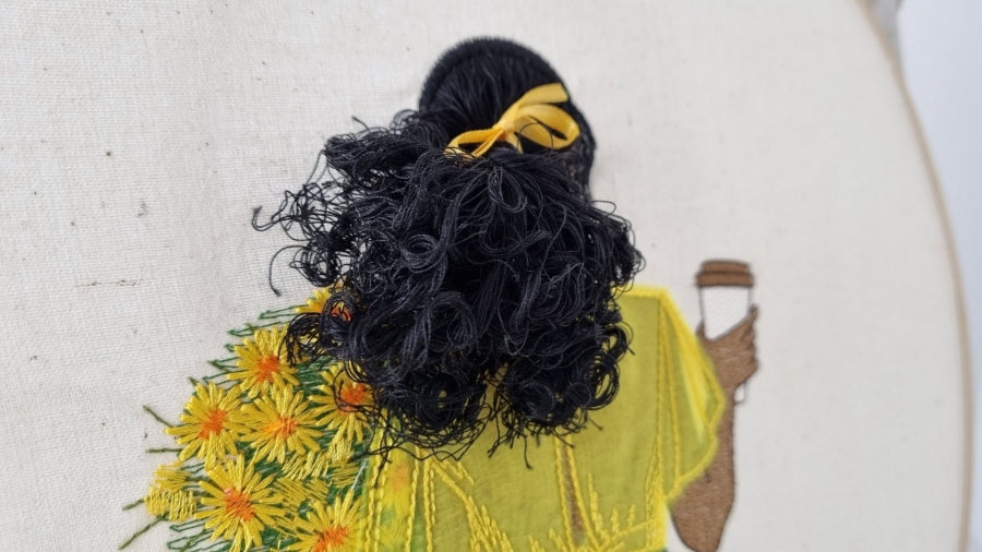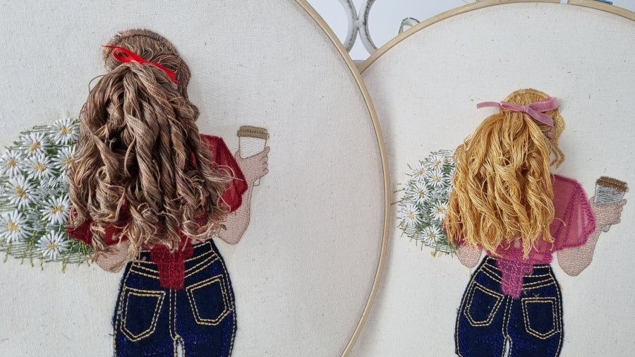 This delightful design features Curly Sue on her way to work, exuding a sense of style and vibrancy as she holds a cappuccino in one hand and a bouquet of flowers in the other. Her beautiful hair is intricately crafted using Zandra's jump technique, adding depth and movement to the design. The raw applique technique brings her funky jeans and light summer shirt to life, showcasing a playful and contemporary look. This charming embroidery piece captures the essence of a busy yet stylish morning, making it a perfect addition to any project.