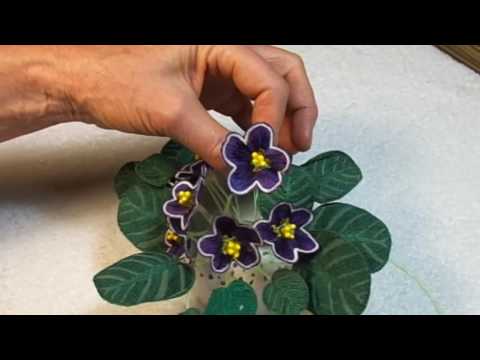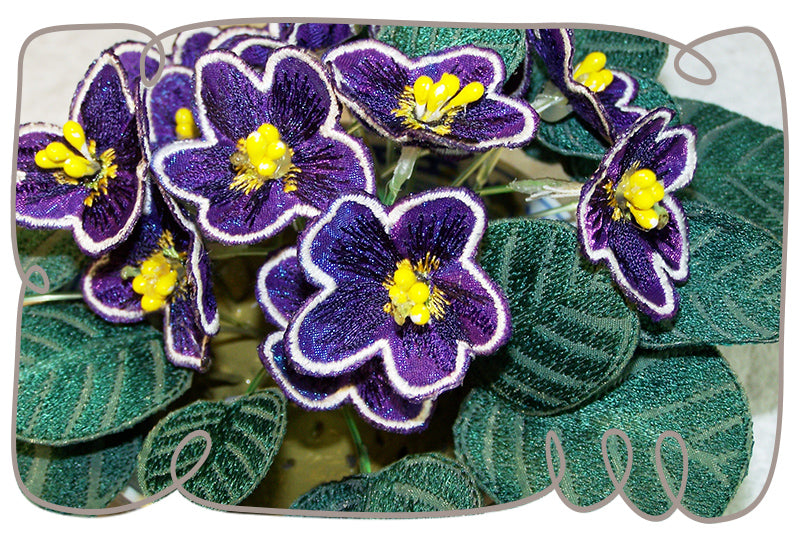 The combination of organza and poly cotton saves up to 70% of embroidery threads as well as time spend to do full embroidery. The end product is a light weight, strong fraying free flower which can be washed if necessary and reshaped. You only have to follow the illustrated step by step instructions to 3D this wonderful pot of African Violets. Your shopping list consists of poly cotton and organza, stamens fishing line and embroidery threads.
