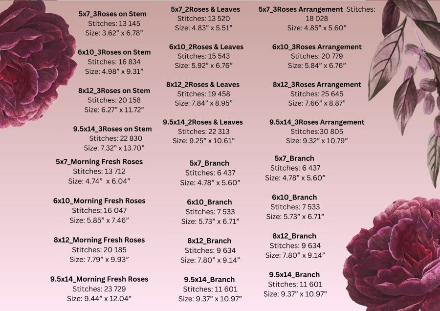 You will receive 11 lovely rose redwork designs most of them in 4 sizes. From 5 X 7", 6 X 10", 8 X 12" to 9.5 X 14". You can create the most beautiful redworks on bedding, pillows or table cloths or even take it a bit further and color the designs after completion for a spectacular technique on your projects.