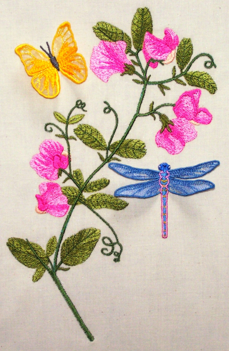 Oh what a beautiful set of Sweet Pea embroidery designs with some 3 D butterflies and a dragonfly ! Be creative with this set and use the butterflies and dragonfly with any design placement. This set is for the 6x8 Hoop. Butterfly and Dragonfly is made with organza fabric and water soluble stabilizer.