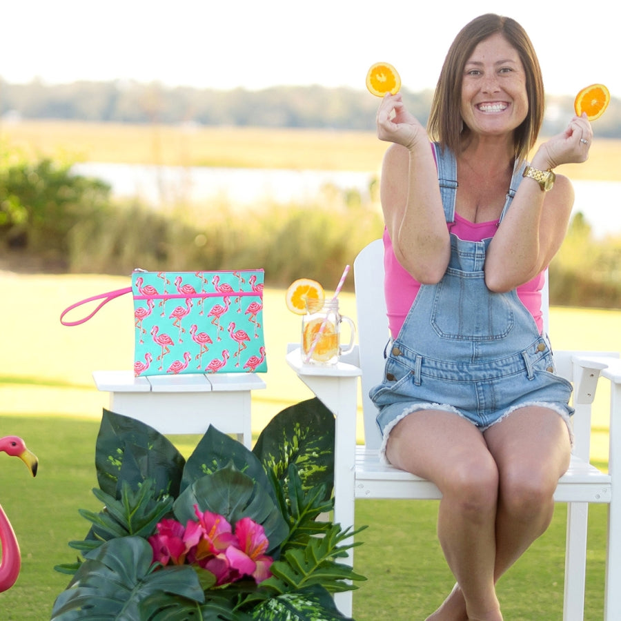 The Tickled Pink pattern features painterly style flamingos in a variety of shades of pink and coral on a mint background.