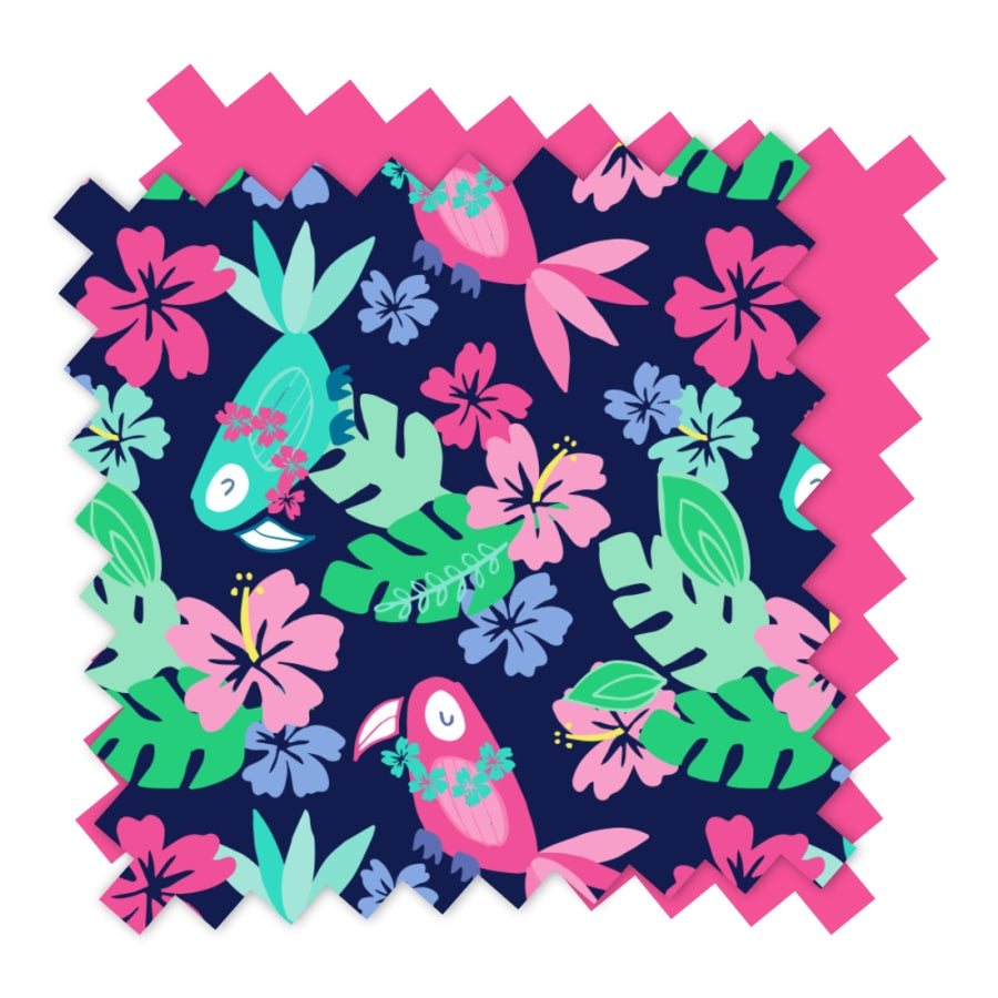 The Tropi-Cool pattern combines fabulously feathered toucans and island inspired florals to create a truly tropi-cool print. This print is comprised of pinks, greens, mint, blue hydrangea, and navy.