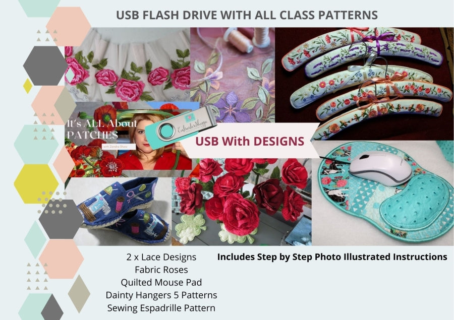 You will receive all the below mentioned products and USB with Design files for the classes. This kit do NOT include, fabrics, threads and other small notions used in the projects. This kit contains hard to find items that we will be using during these classes.